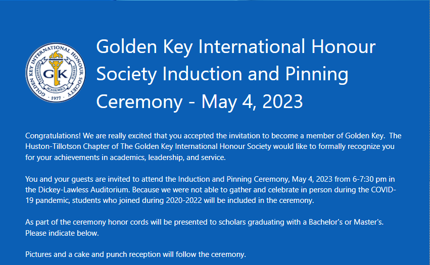 Houston Tillotson University believes in excellence and strives to provide the best environment possible for guiding our Golden Key members to achieve in academics, leadership, and service. The 396th Golden Key chapter, Huston-Tillotson University was chartered December 16, 2010, as a part of U.S. Region 7, which includes schools in Louisiana, New Mexico, Oklahoma, and Texas.